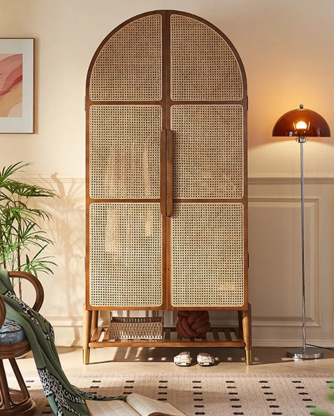 Handmade Solid Wood & Rattan Arched Wardrobe for Bohemian Modern Interiors
