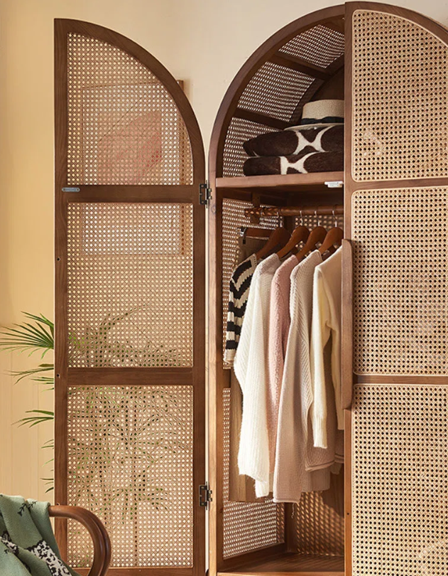 A handmade solid wood and rattan wardrobe is the perfect blend of beauty and functionality. With its unique arched design, premium materials, and optimal storage features, it is an excellent choice to complete your bohemian modern interior while serving as a long-term furniture investment.